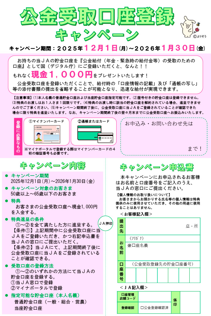 期間中、JA窓口・マイナポータルのいずれかの申請方法で、公金受取口座に県内JAの貯金口座を登録されたお客様(50歳~65歳の方)に、現金1,000円の特典を進呈します。